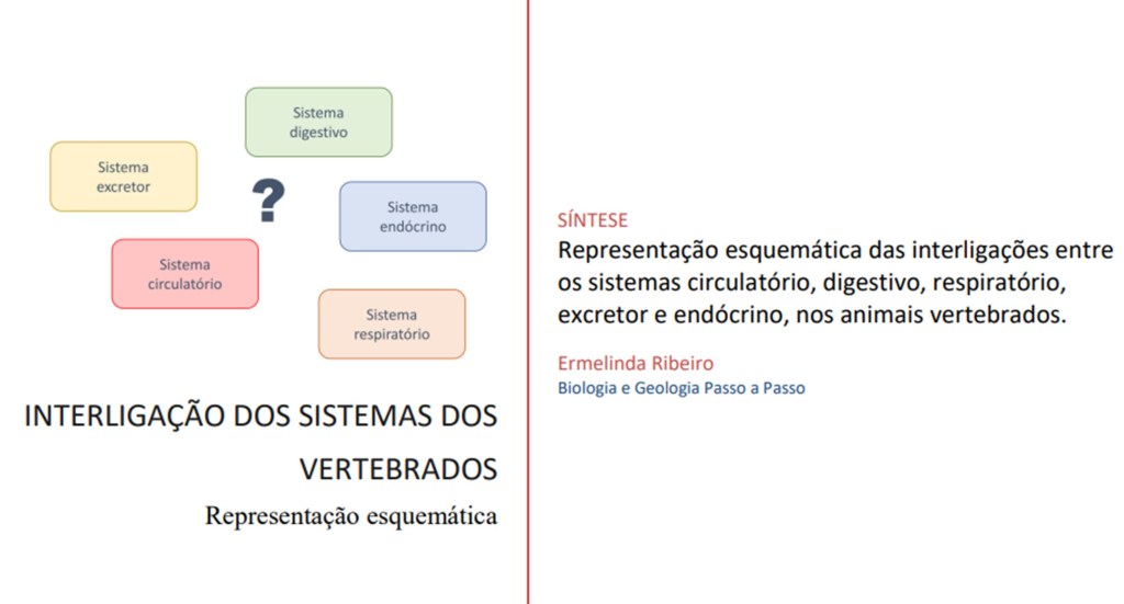 A ficha tem 2 páginas, uma folha de rosto e 1 página com esquema que estabelece as ligações entre cinco sistemas dos vertebrados. Esta ficha ajuda os alunos a terem uma perspetiva do indivíduo multicelular vertebrado como um todo ao colocar em simultâneo as principais relações entre os sistemas circulatório, digestivo, respiratório, excretor e endócrino.